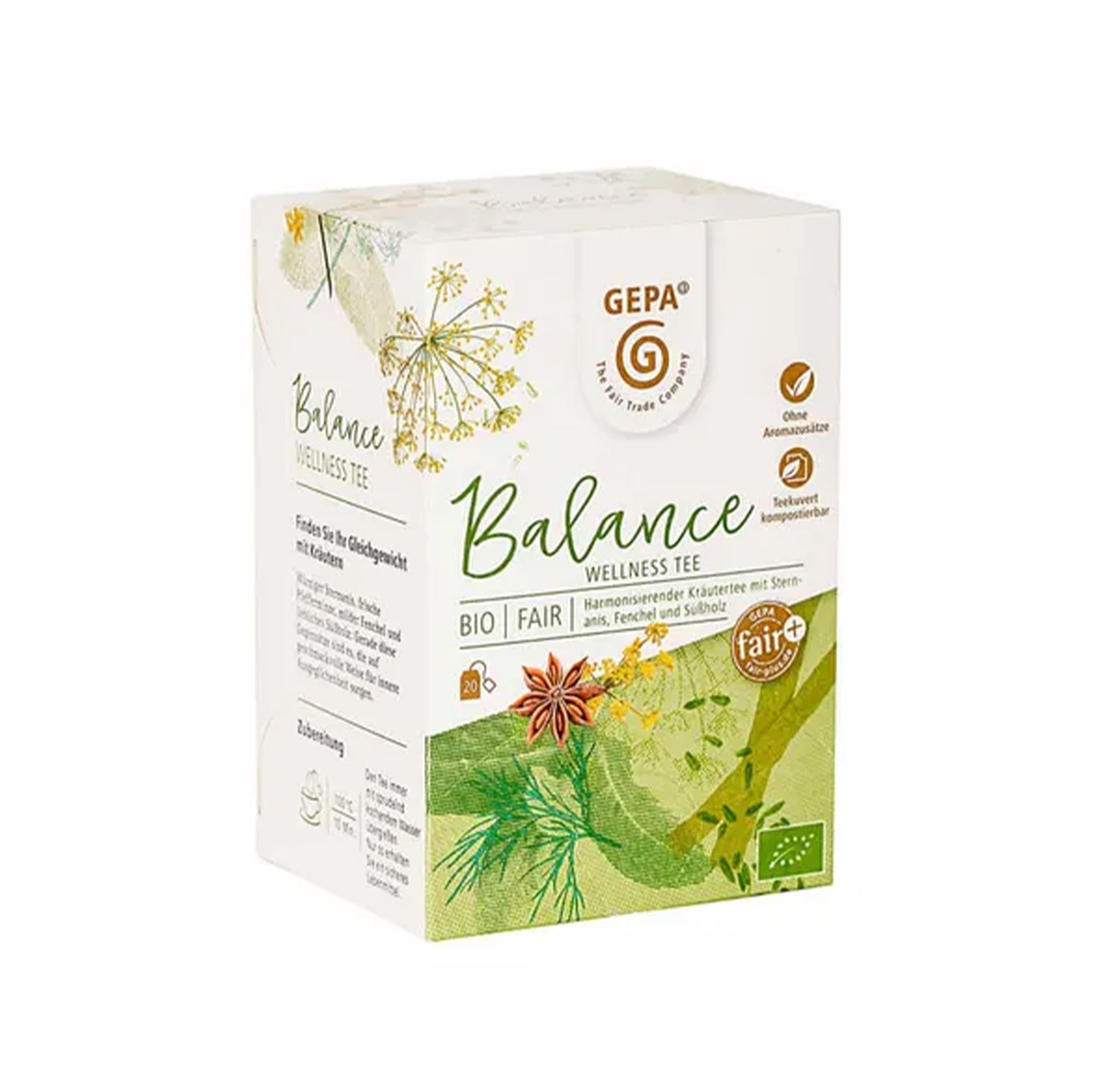 Die pikante Note des Sternanis, die würzige Pfefferminze, der milde Fenchel und das liebliche Süßholz vereinen sich in unserem Balance Tee zu einem harmonischen Geschmackserlebnis, das innere Ausgeglichenheit auf geschmackvolle Weise schenkt.