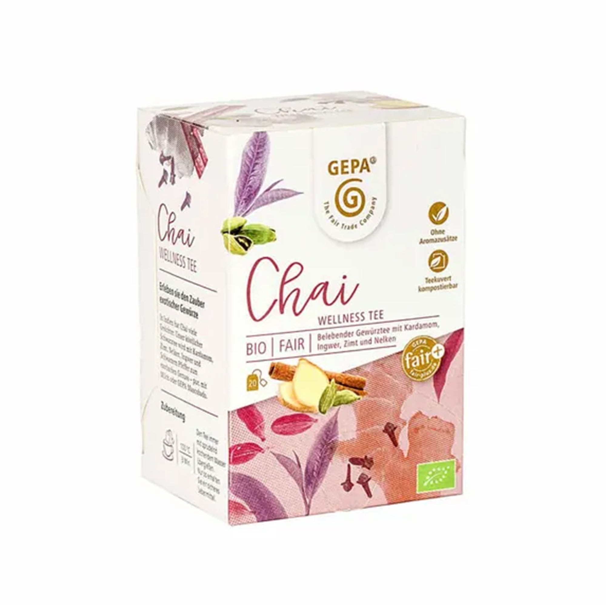 Masala Chai ist in Indien eine traditionsreiche Spezialität. Sein Name steht für eine kunstvolle Mischung aus Schwarztee und Gewürzen wie Kardamom, Zimt, Nelken, Ingwer und schwarzem Pfeffer. Jede Packung enthält 20 praktische, kompostierbare Teebeutel, gefüllt mit erfrischendem Chaitee (gemäß EN13432 zertifiziert).