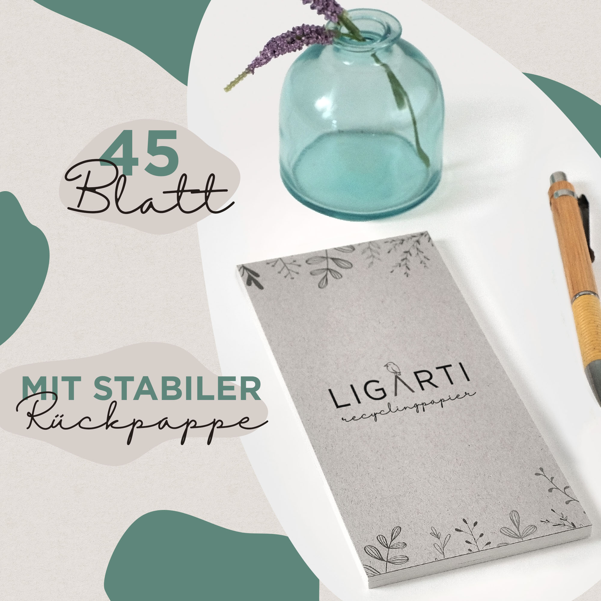 • 45 sheets of 100% recycled paper without linear paper (certified with the blue angel)