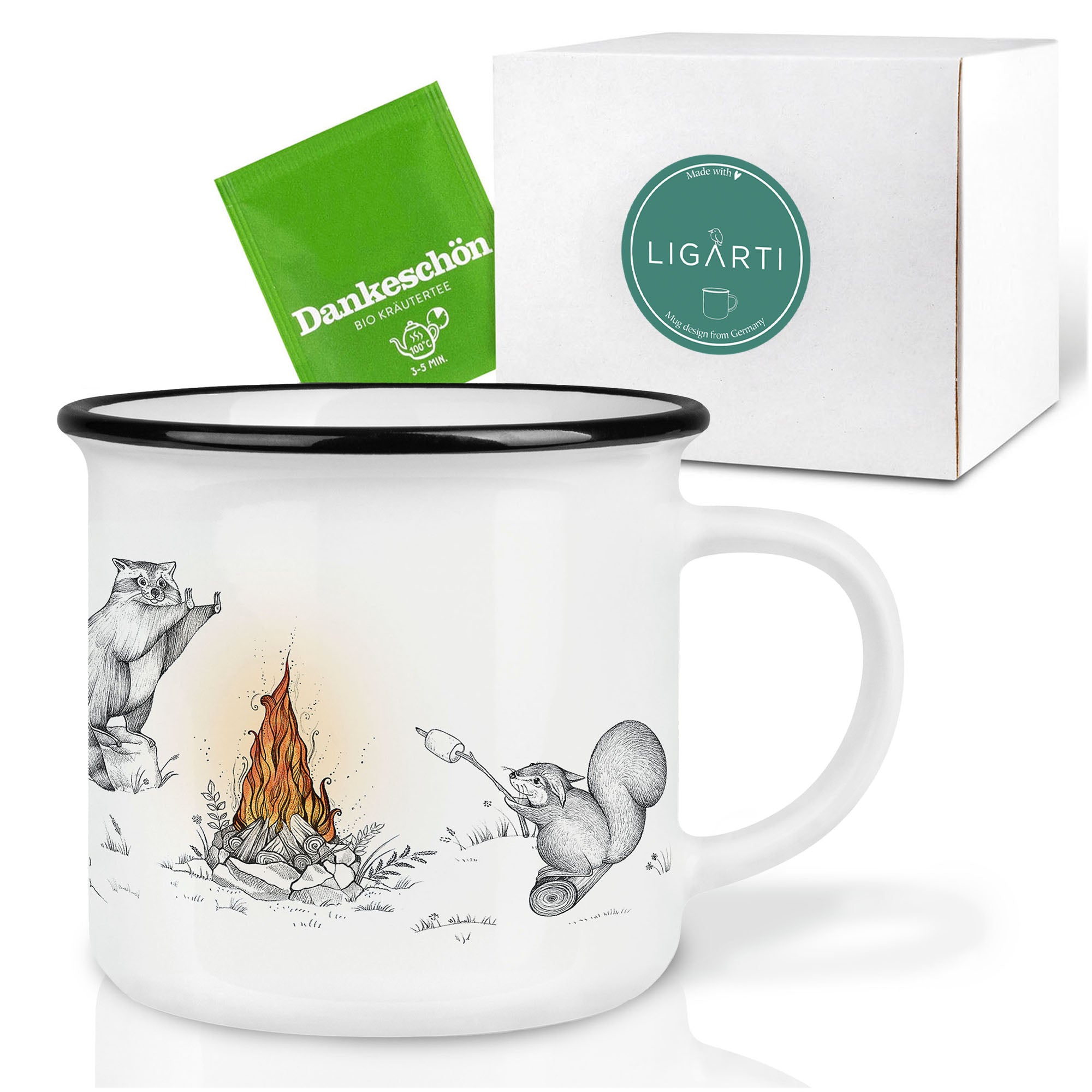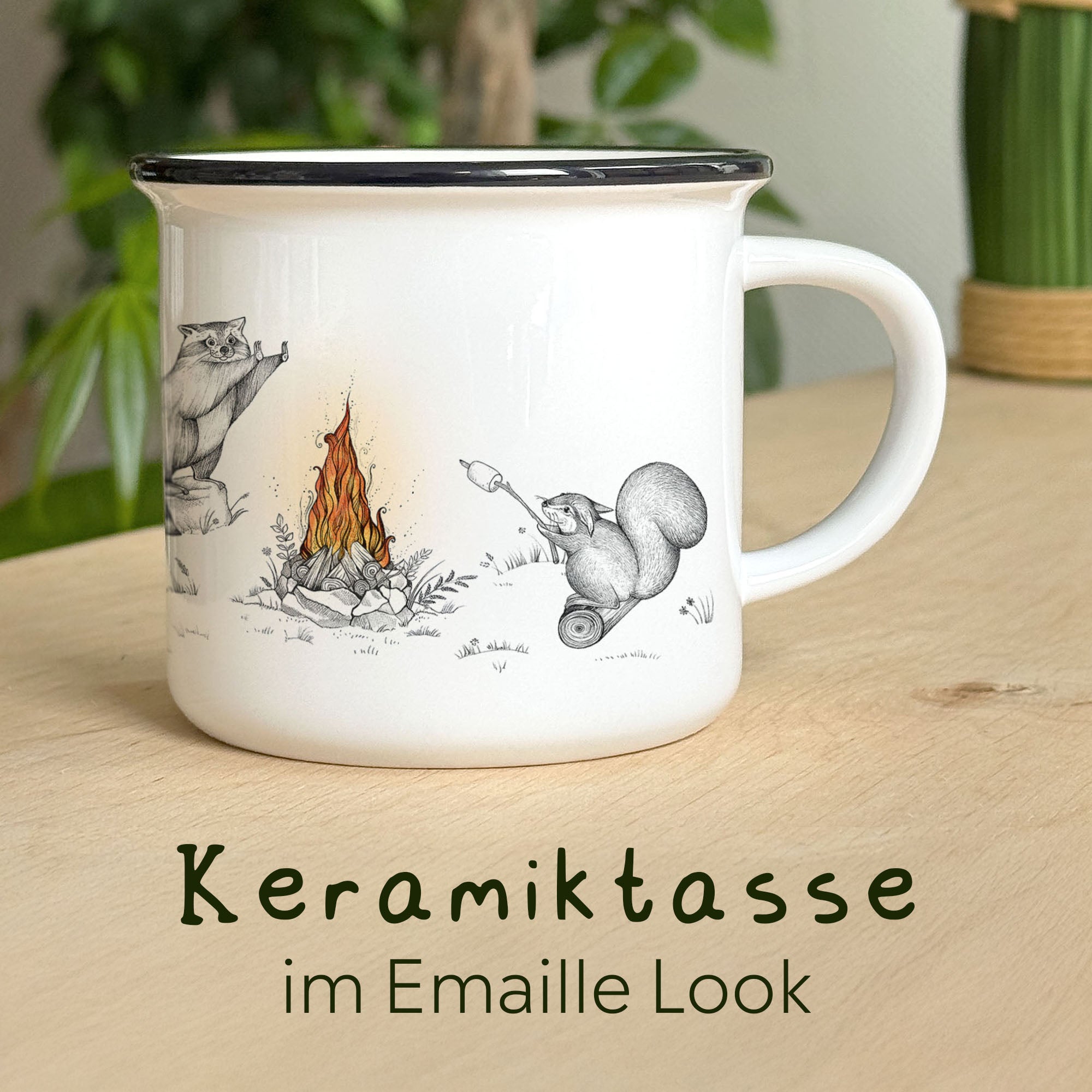 Keramiktasse mit Maulwürfe, Waschbär und Eichhörnchen am Lagerfeuer – dein neuer Hingucker am Küchentisch